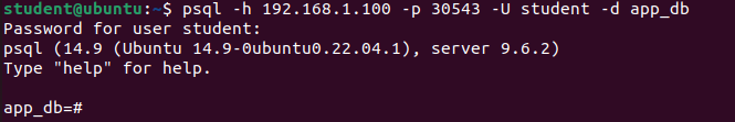 $ psql -h 192.168.1.100 -p 30543 -U student -d app_db