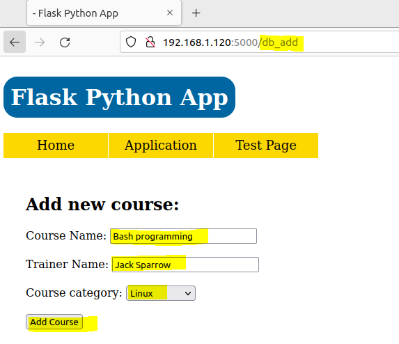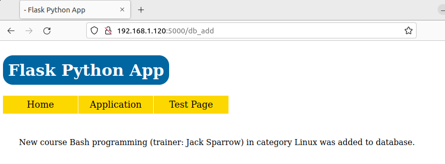 db_add_post()to handle/db_addURL withPOSTmethod that is triggered by submit button inadd.htmlpage. Values from all 3 input fields are gathered and used to insert a new entry into database. As a final result function is rendering theinit.htmlpage fromtemplatesfolder showing the status of adding new course into database: