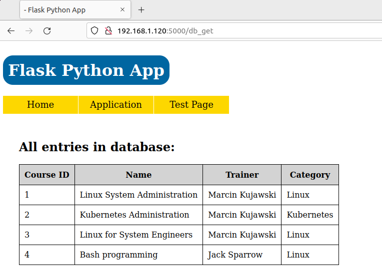 Perfect! So the last validation would be to list all courses. All entries should include my new course added one step before. Let’s again navigate to “Application” -> “Get courses” which is triggering /db_get app route and observe what we have here.