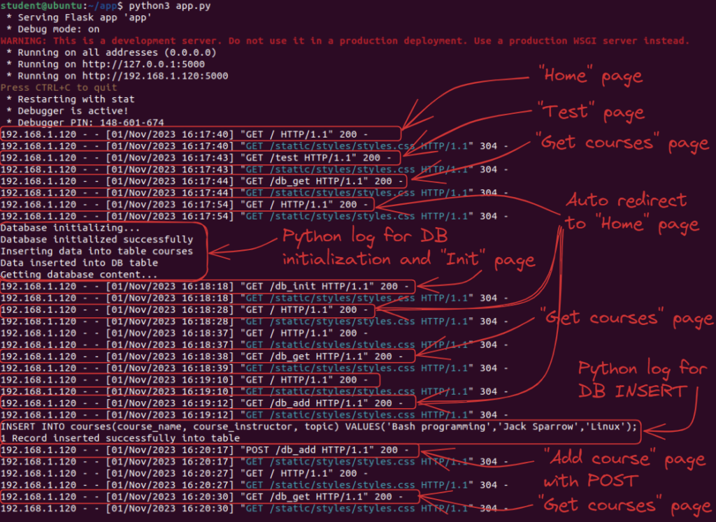 If you want to look into the Python Flask logs, you can find all Python “prints” as well as each of the HTTP request I have done by searching the HTTP codes and method executions or by specific URL (app route). I can easily identify when I click what based on the below log output.