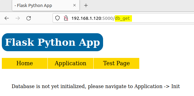 I was moved to the /db_get URL that is showing me the information that database of my application was not yet initialized and I need to go first into “Application” -> “Init”.
