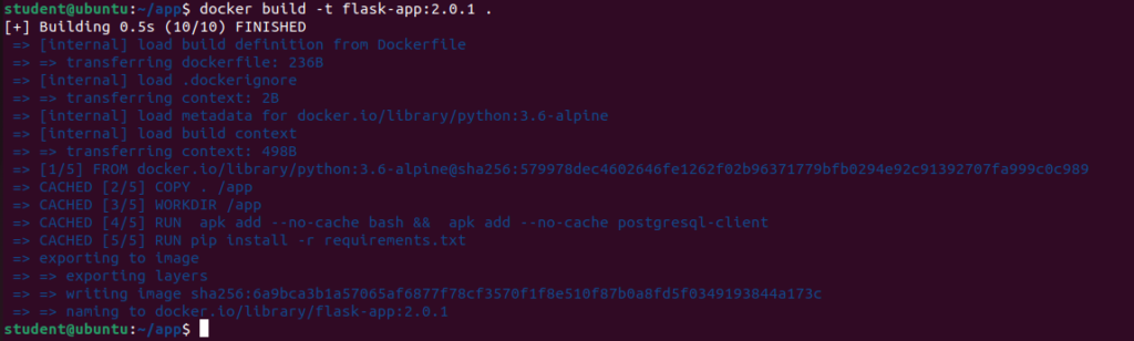 $ docker build -t flask-app:2.0.1 .Above will build the image and you should see the output similar to this: