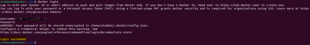 $ docker loginYou will be prompted for username and password and when you provide correct credentials you should see “Login Succeeded” message like below.