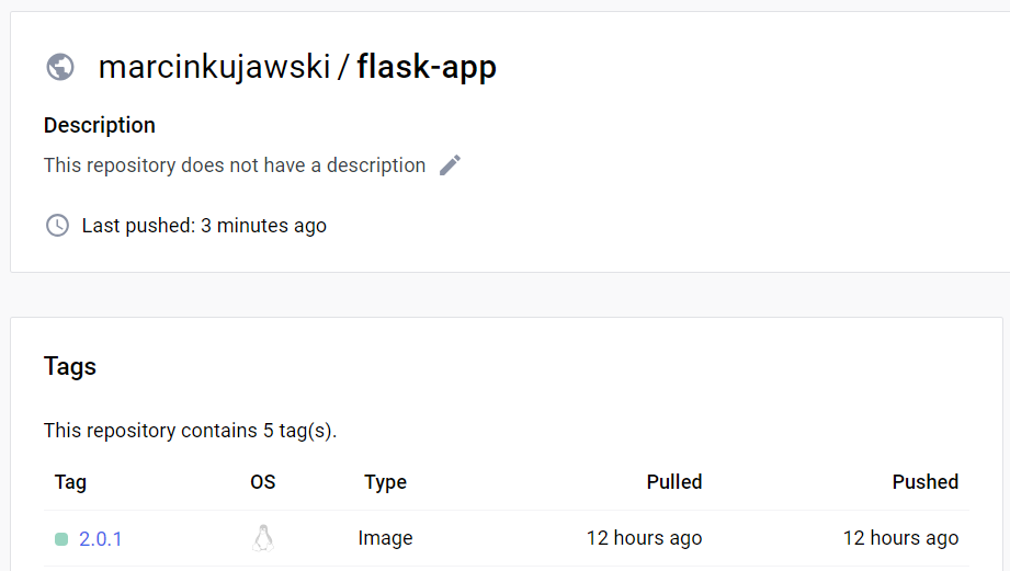 $ docker tag flask-app:2.0.1 marcinkujawski/flask-app:2.0.1Last step is to push tagged image to the repository by doing: