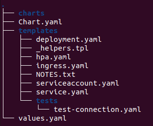 $ helm create flask-appBy default Helm should create a following folder structure: