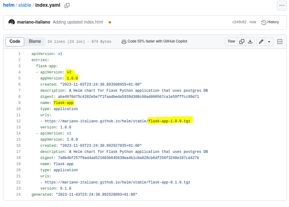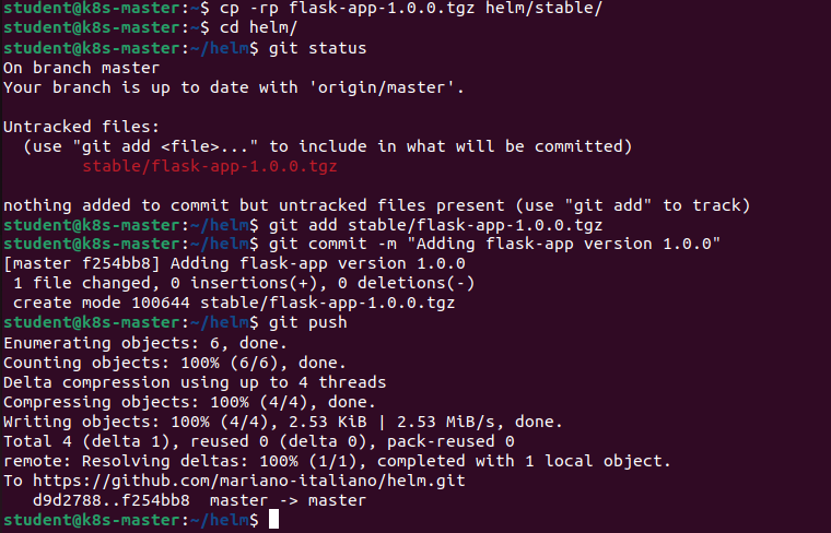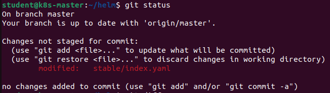 That command adds next version of our application package to the Helm repository. To validate if index.html file is modified you can do: