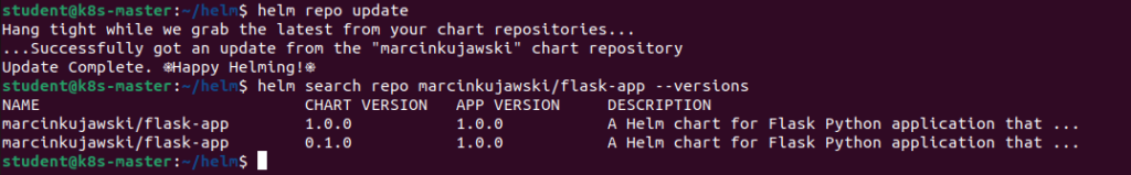 As you can see two versions are listed which means all versions are available to install. That’s all I wanted to cover. It is quite a long journey that we already finished, but hope it will leverage your knowledge about how to transform your legacy applications into modern, containerized architecture. Happy Helming!