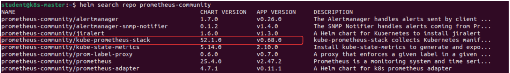 $ helm repo add prometheus-community https://prometheus-community.github.io/helm-chartsPrometheus and Grafana charts were moved to “kube-prometheus-stack” so we can validate if we see that, once we have added above repos: