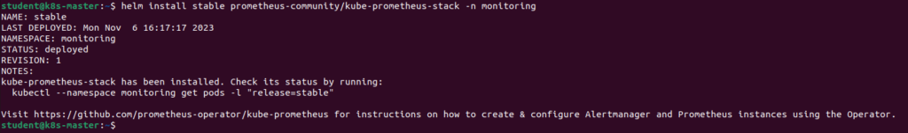 $ helm install stable prometheus-community/kube-prometheus-stack -n monitoring