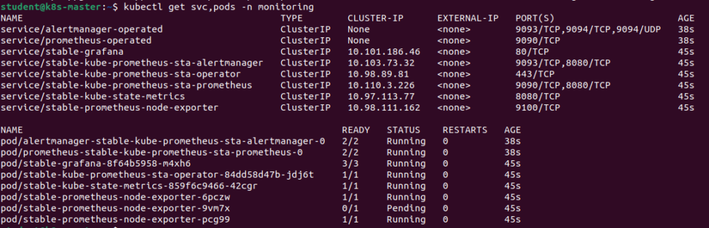 Statuses are fine, all is as expected. This confirms that Prometheus and Grafana have been installed successfully using Helm.