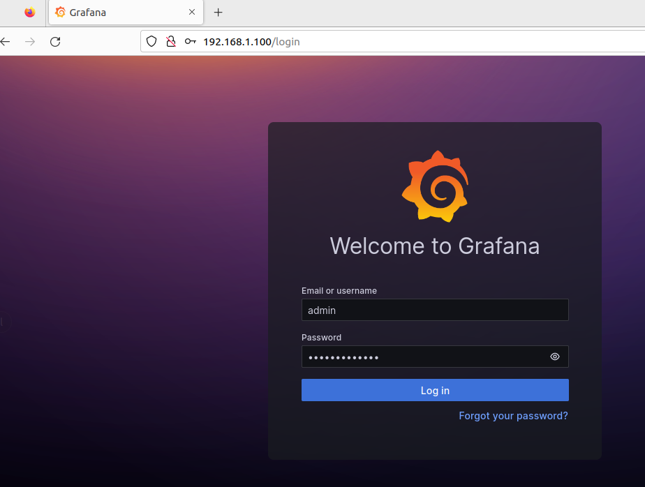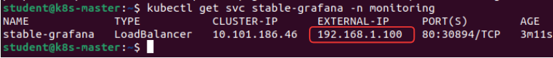 By default this setup is only available inside the cluster, so to make our Grafana UI available outside the cluster, I will change the service type to LoadBalancer with predefined IP address. You can also update it to NodePort instead of ClusterIP. Of course it will also work too.