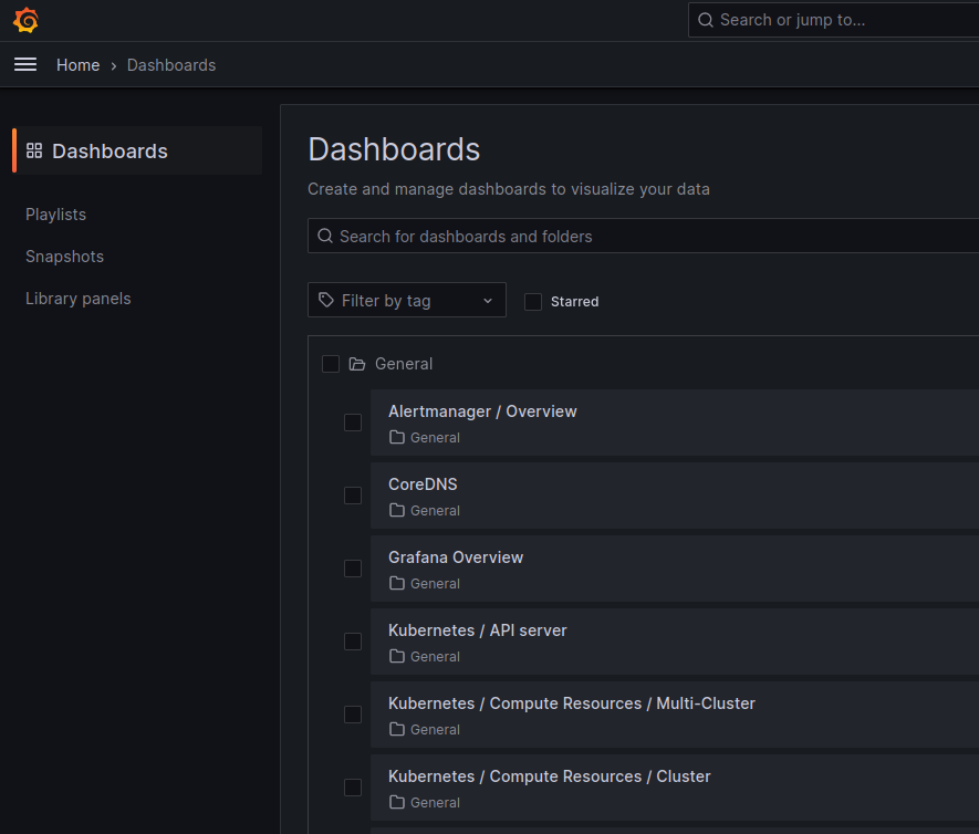 Once we are inside the Grafana web UI, there are a lot of things you can do. You can set the duration of scraping metrics. You can also configure your dashboard or look into networking. There are lots of dashboards provided by default, you can explore them on your own, to look at them just navigate into “Home” > “Dashboards” and then go to “General”. Here you find all predefined dashboard ready to use.