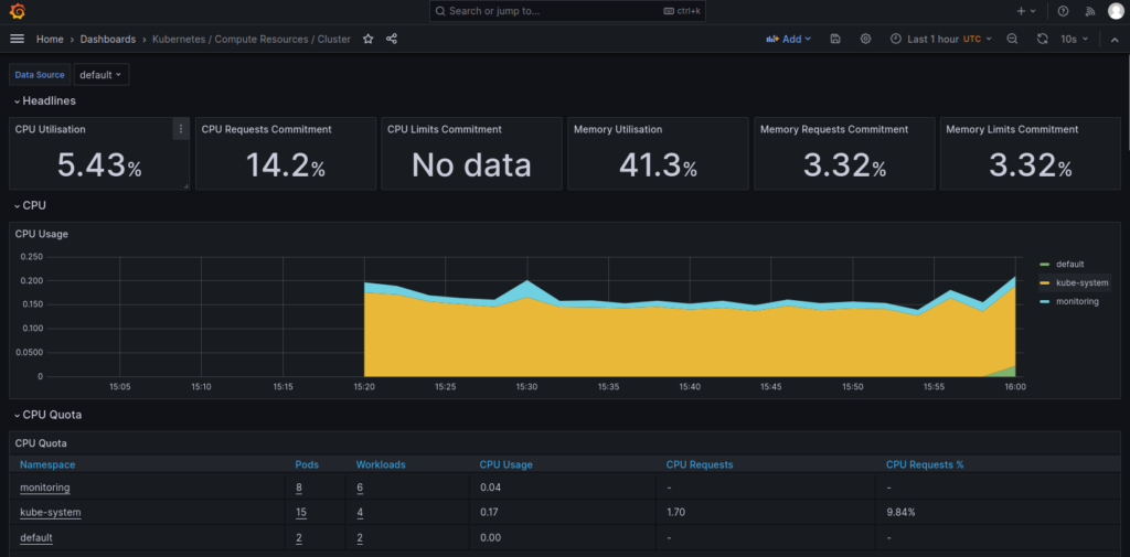 $ kubectl create ns monitoringNext step is to install “kube-prometheus-stack“. Prometheus comes with a Grafana deployment embedded, so we don’t need to worry about anything more, just execute one command: