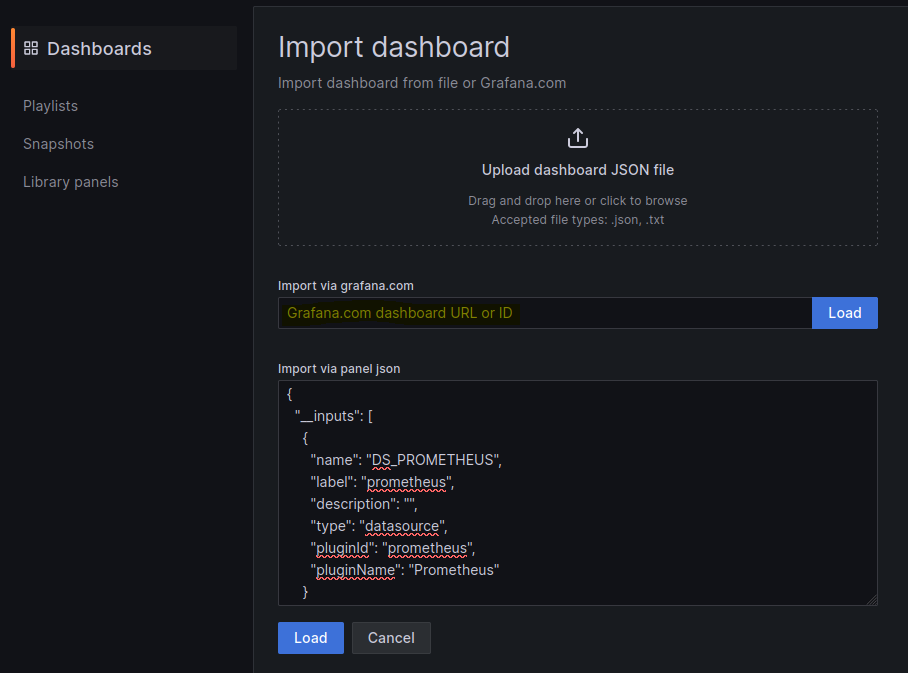 Enter dashboard ID from Grafana.com (i.e. 12740) or paste the JSON for particular dashboard – you can copy it also from the same site.