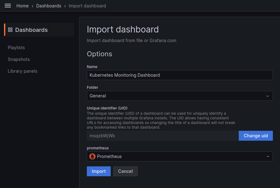 Click “Load”. Select “Prometheus” as the endpoint under prometheus data sources drop down and click “Import”. This will show monitoring dashboard for all cluster nodes.