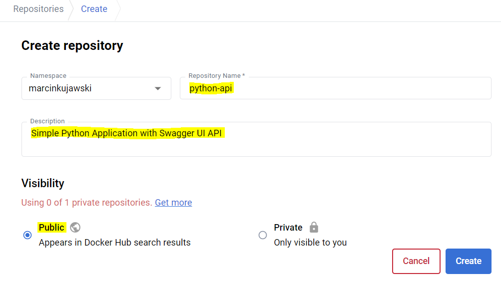 Before pushing Docker image into Docker Hub we need to create a repository for our image. Go to the main Docker Hub page and click Create Repository. Fill all the required data as presented below: