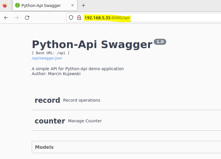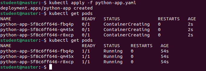 As a really final step I will create a Kubernetes deployment named python-app, which will run 3 replicas of the container that will test my Docker marcinkujawski/python-api:1.0 image. I’m also exposing port 8080 in the container as by default my application is using it. Here is the content: